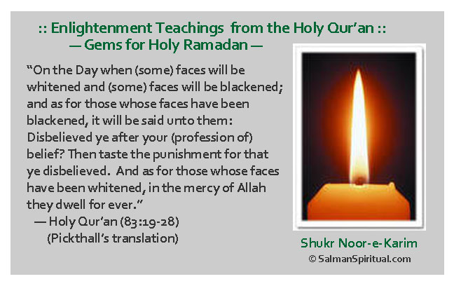 "Lo! the righteous verily are in delight, On couches, gazing, Thou wilt know in their faces the radiance of delight." — Holy Qur'an 83:22-24